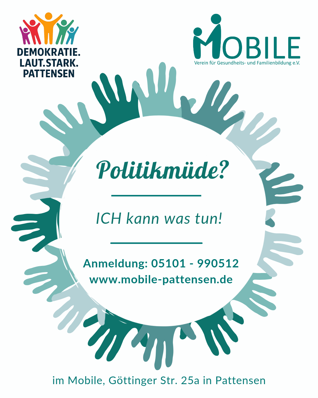 Dekorativ - Foto: Logo Demokratie. Laut.Stark.Pattensen. Bunte Figuren. Logo MOBILE. Demokratie im Gespräch am 11.02.2026. 19:30 - 21:00 Uhr mit Arthur Rupp, Bündnis gegen Extremismus Laatzen. Im Mobile, Göttinger Str. 25a, Pattensen. 2. Bild: Politikmüde? - Ich kann was tun! Anmeldung: 05101-990512, www.mobile-pattensen.de